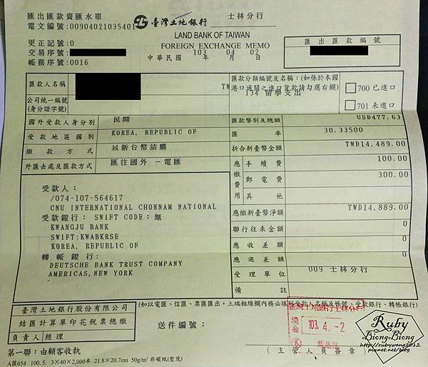 土地銀行因為匯款到韓國還需要中間商,所以中間商還會再多跟我收18塊美金